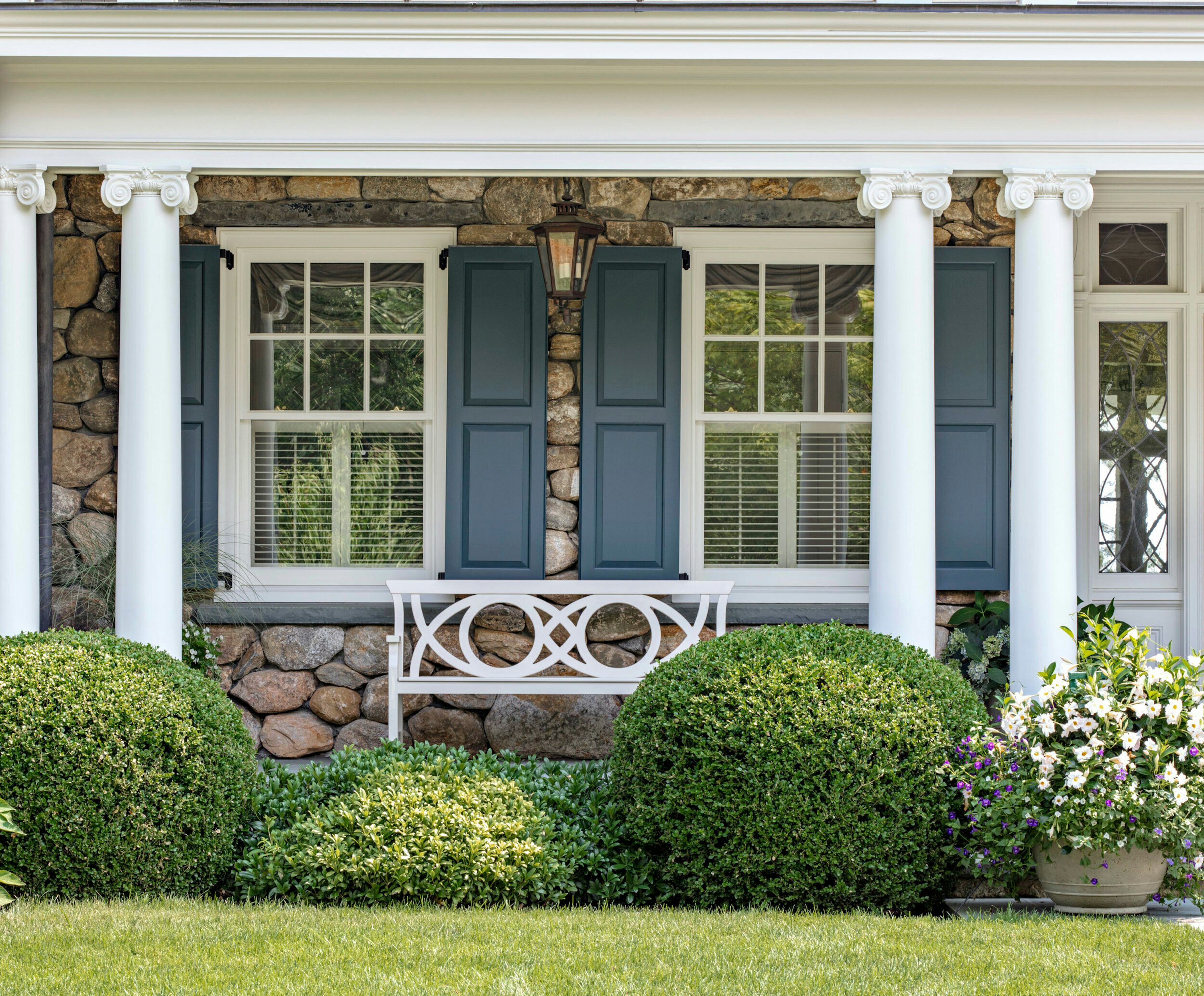 Decoro’s Scamozzi fiberglass columns and custom PVC railing systems add subtle character to the home’s welcoming front porch. Decoro’s premium columns were also used to enclose the two rear covered porches – both designed to make the most of the home’s stunning waterfront views. Other scopes provided by Decoro include the PVC rooftop gooseneck rails and chippendale panels, custom newel posts, PVC lattice panels, decorative entry pilasters, and custom fiberglass urns.